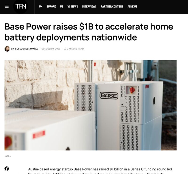 Base Power raised $1 billion in Series C, which is the largest round ever for residential energy infrastructure. This isn’t just a funding milestone. It’s institutional capital finally recognizing home batteries as grid infrastructure, rather than consumer hardware.