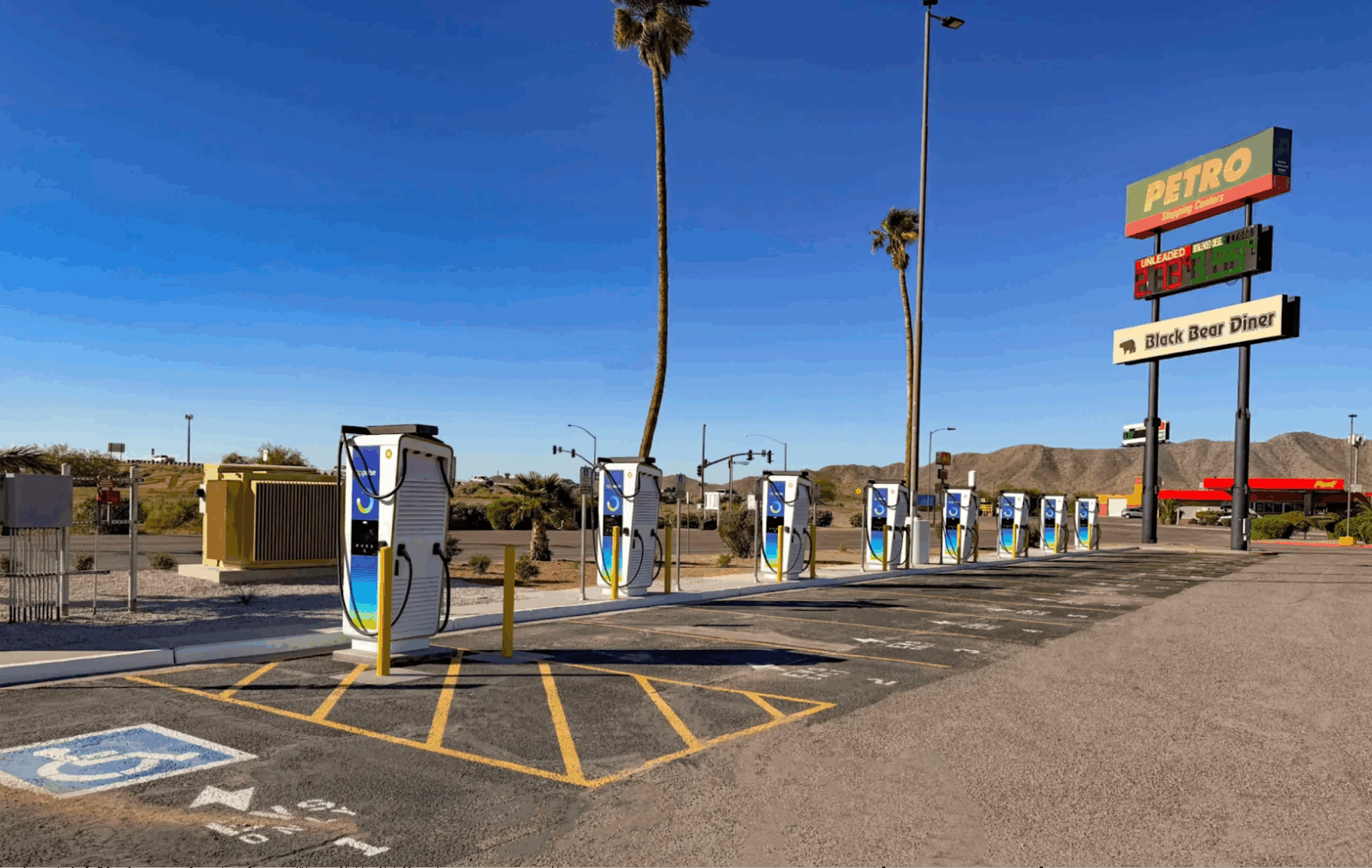 Arizona Launch: A substantial 16-bay installation at the Petro Travel Center in Eloy (conveniently located off I-10) features chargers delivering up to 400 kW with both CCS and NACS connectors, plus comprehensive on-site amenities including a diner, ATM, barber shop, convenience store, and clean restrooms.